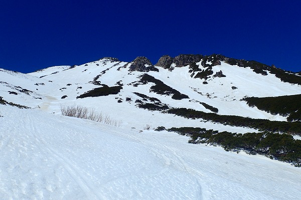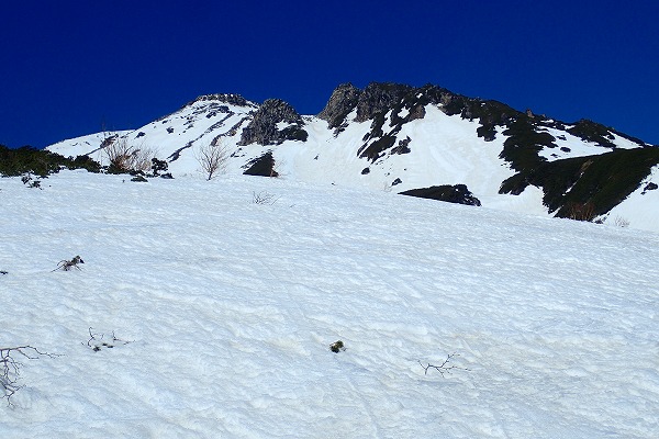 2900mを超えて稜線に出た地点で登高終了、稜線上でも微風快晴でゆっくりと休憩できた。
