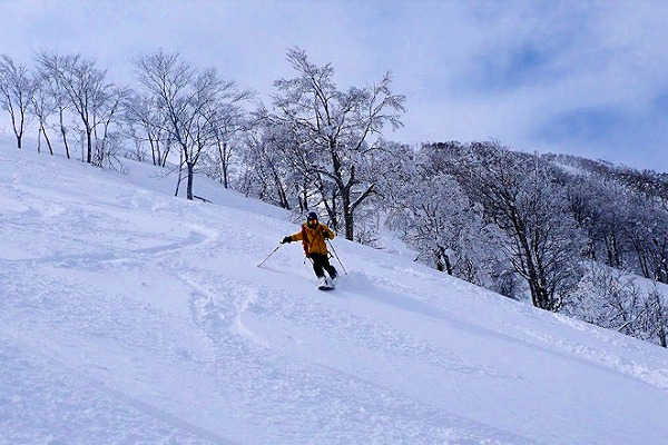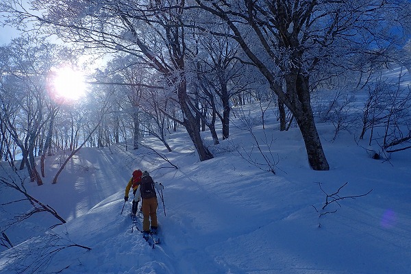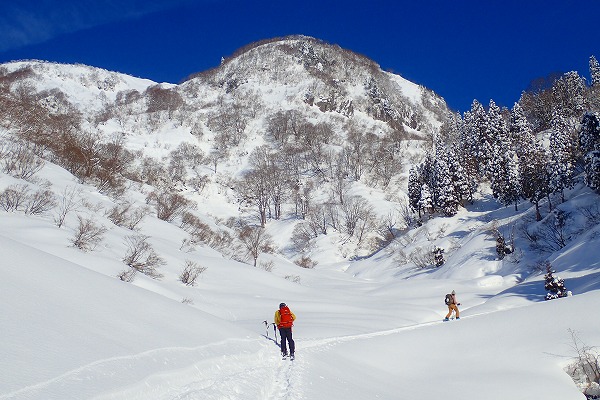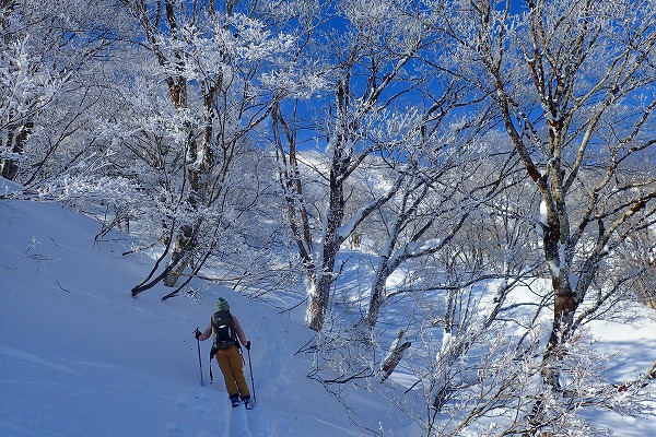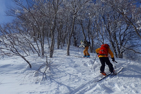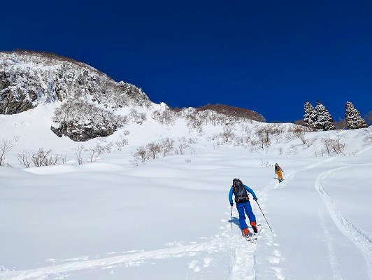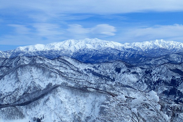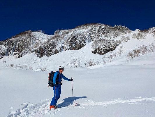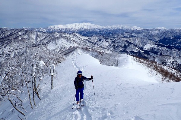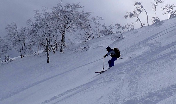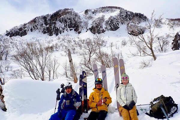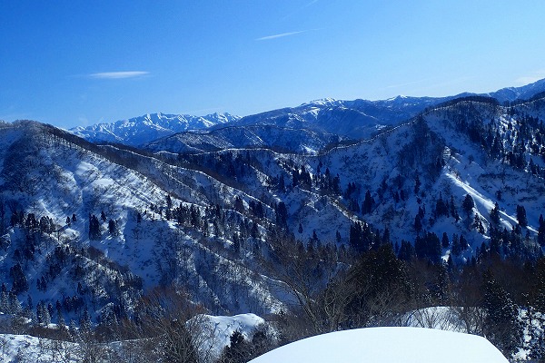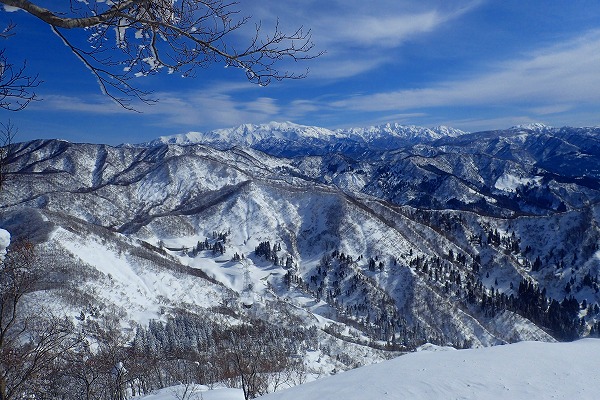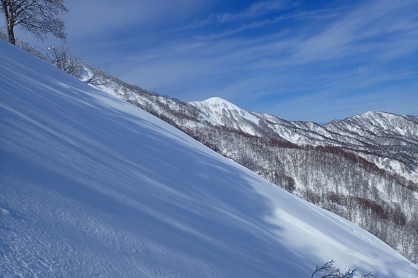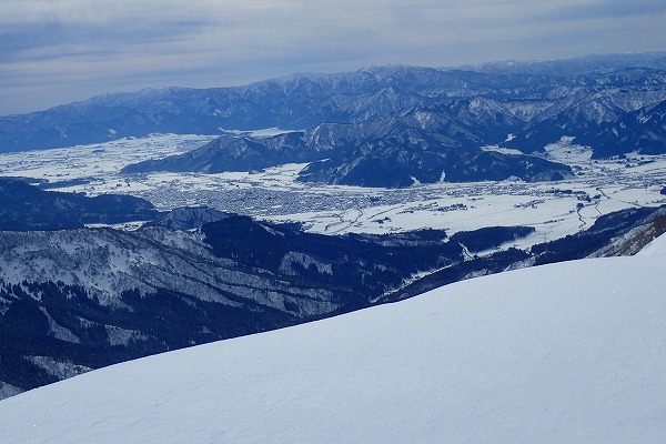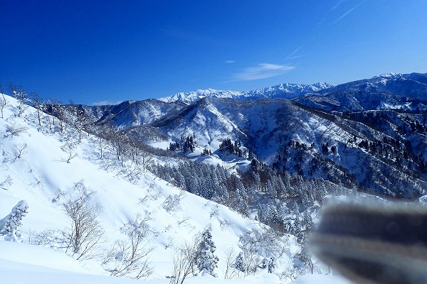 北面の滑りでちょっぴりパウダーを味わい南面はモナカ雪の安全運転で帰還。白山の大展望が見られたので満足。