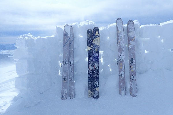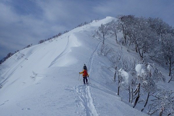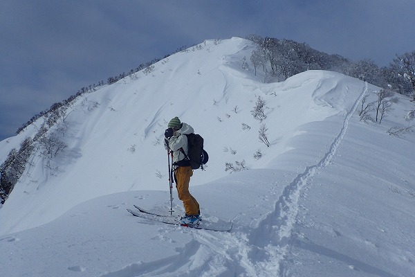 ゲンちゃんグループの先行トレースがあったおかげでラッセルは免れたが、稜線上は爆烈風が吹き荒れ苦行の登り。山頂では先行者が残してくれた雪壁のおかげでなんとか下山準備ができた。