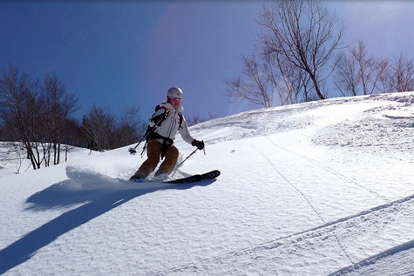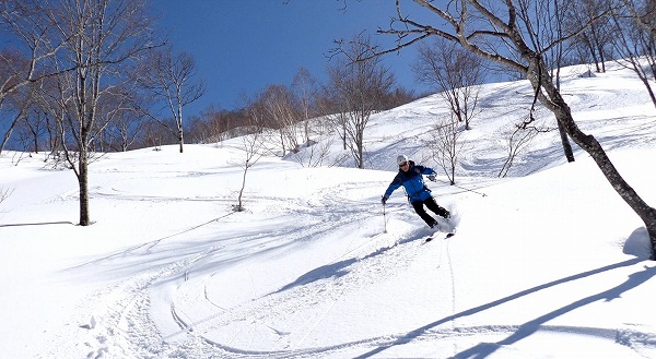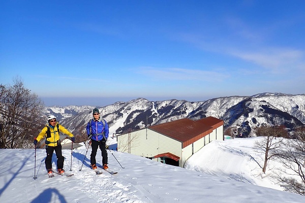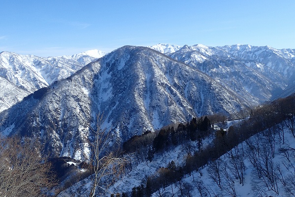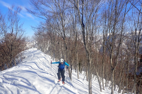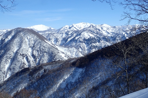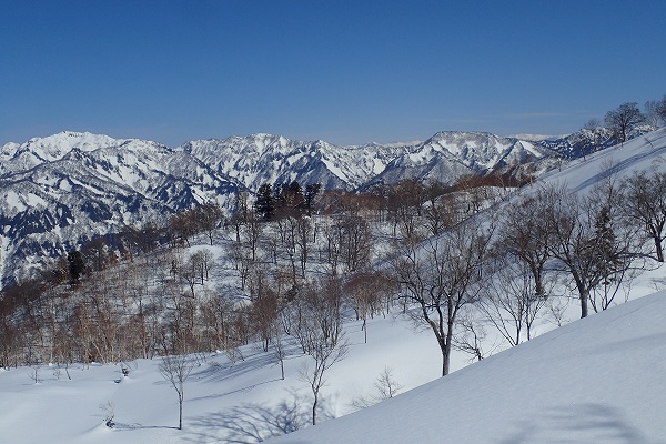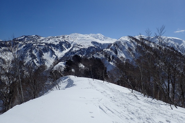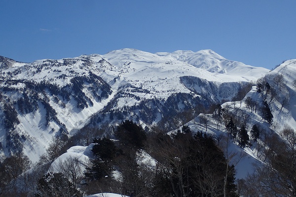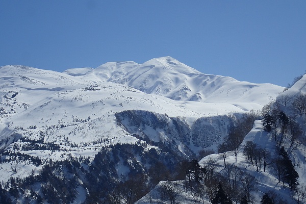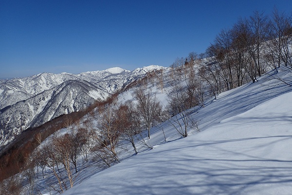 これ以上無い微風快晴の空のもと、いつもと違う方向から見るまっ白な白山の大展望と、底付きではあるがしっとりクリーミーパウダーの雪を堪能できた、満足度の高い山行だった。